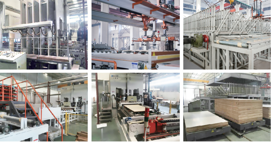 横向型快速贴面生产线主要适用于各种木材面板与三聚氰胺浸渍纸装饰纸贴面,可压制木地板、家具板、门板。适用于生产各种尺寸的产品,如: 4'x6', 4'x8', 4'x9', 6'x8', 6'x9', 7'x9'等。压力从1200吨-14000吨,通过运用不同纹路的钢模板,可以压制亮光,哑光,大理石纹,木纹等。